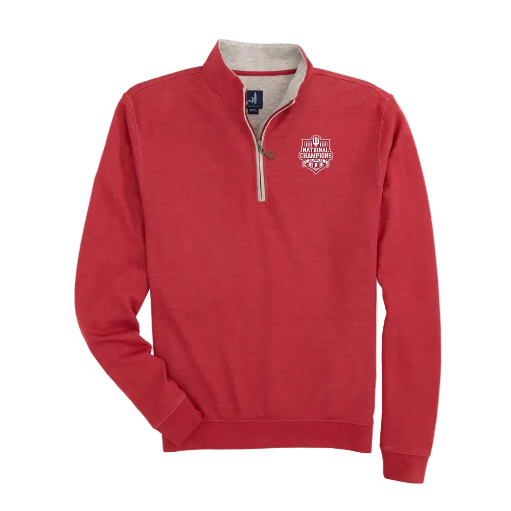 Discover johnnie-O's best-selling quarter zip and celebrate the Hoosier's National Championship! Featuring the embroidered champions logo, and made of incredibly comfortable fabric, the Sully feels like your favorite sweatshirt but looks like your nicest sweater. It gets better with every wash. The Sully's collar perfectly rests over all polo and button-down collars for a sharp 1-2 combo. Smart but subtle details like the contrast zipper trim, the tonal logo on the back, and the leather zipper puller continually make this a best seller.