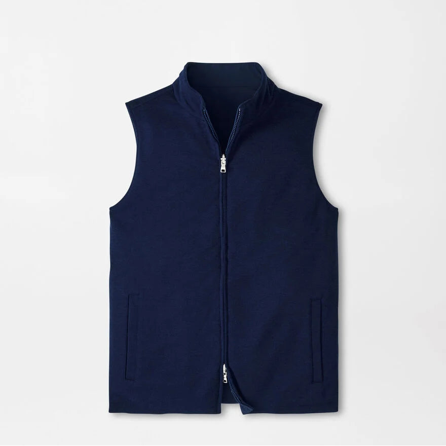 Perfectly capturing the spirit of Peter Millar Crown Crafted, this new vest offers sophisticated style and uncompromising function. With water-resistant, windproof stretch microfiber on one side and ponte-knit Merino on the reverse, it's primed for transitional weather, no matter the setting.