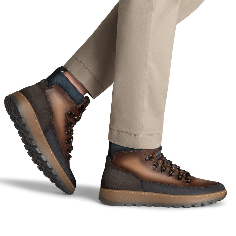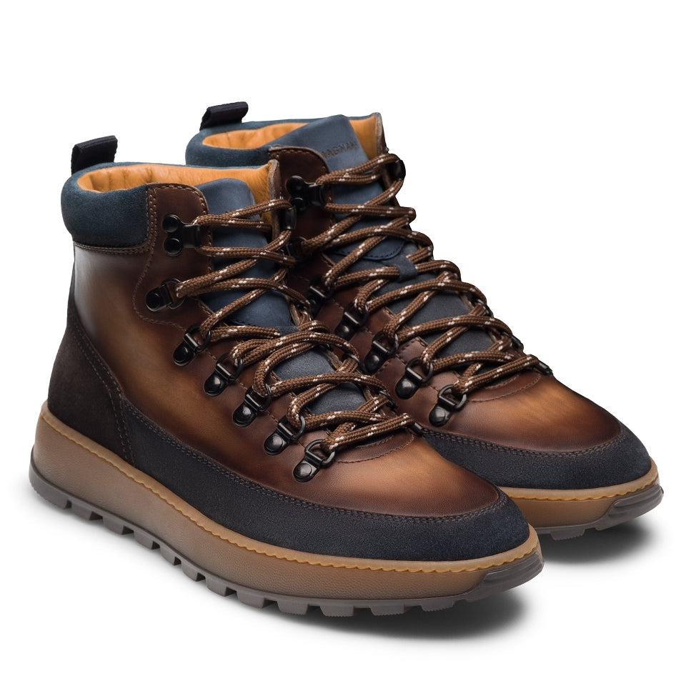 Introducing the Borazo hiker, where rugged functionality meets modern style. Inspired by the casual hiker boot, the Borazo features robust D-ring eyelets for a rugged appearance and a caramel-colored treaded sole for contrast. The unique texture blocking design enhances the visual aesthetic for all your urban adventures. Experience the perfect blend of comfort, durability, and contemporary aesthetics with the Borazo.